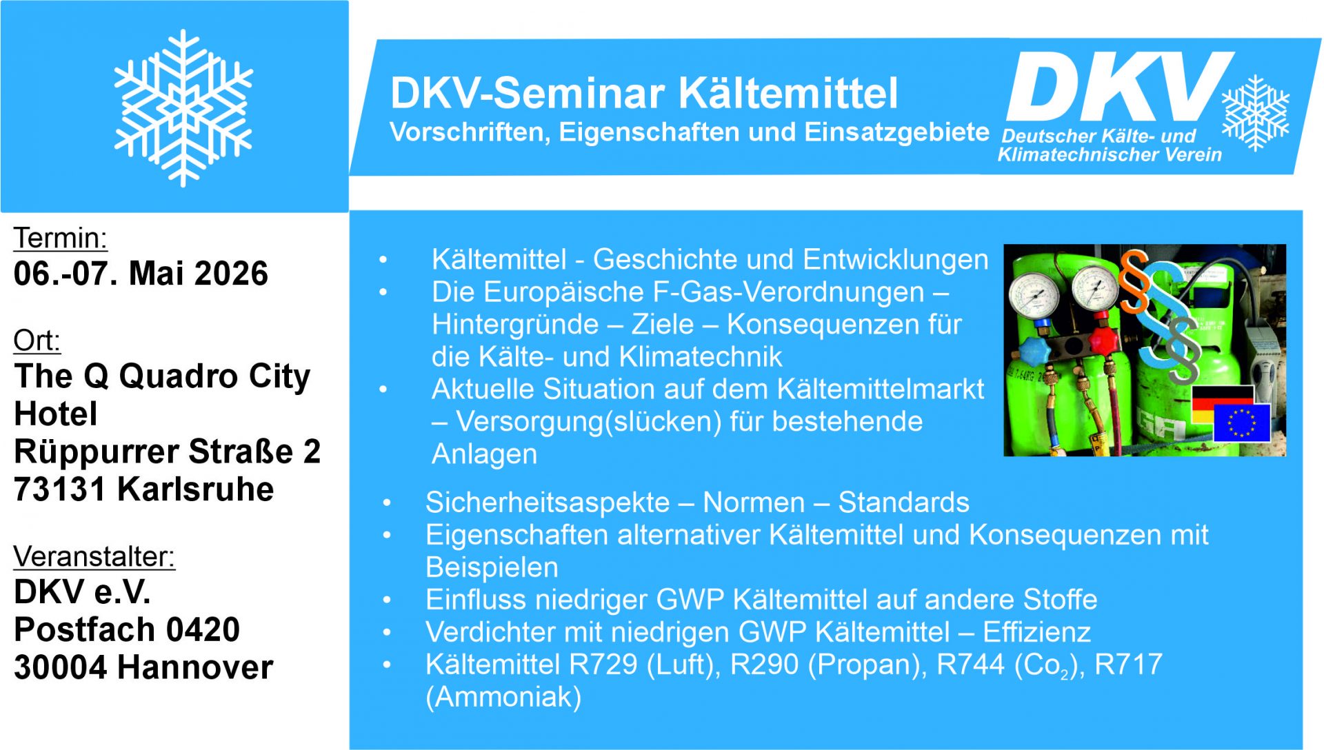 Ziel des Seminares ist ein intensiver Erfahrungs- und Wissenstransfer, der durch grundlegende Vorträge Kenntnisse über den Wechsel zu alternativen Kältemitteln und die Konsequen-zen für die einzelnen Komponenten und ihre Betriebsmittel zur Folge haben.